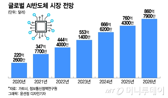 실제로 가트너가 5월 발표한 보고서에 따르면, AI반도체 시장규모는 지난해 444억달러(60조1300억원)에서 올해 553억달러(74조8400억원)로 24.5% 증가했고, 연평균 19.9%씩 커져 2026년에는 861억달러(116조4700억원)까지 성장할 것으로 나타났다.