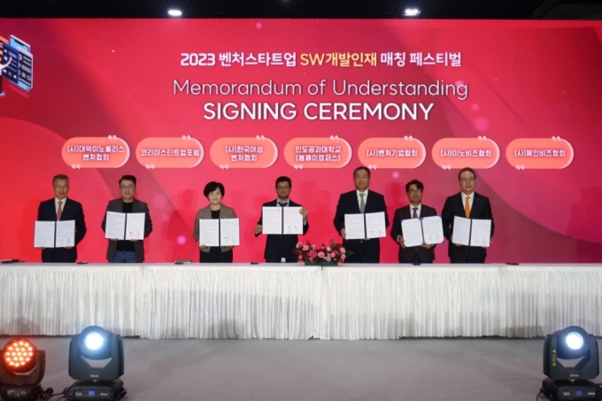 업무협약식은 이날 서울 삼성동 코엑스에서 열린 '2023 벤처스타트업 SW개발인재 매칭 페스티벌'에서 진행됐다. 벤처기업협회를 비롯해 대덕이노폴리스벤처협회, 메인비즈협회, 이노비즈협회, 코리아스타트업포럼, 한국여성벤처협회 등 벤처업계 협단체들이 참여했다.